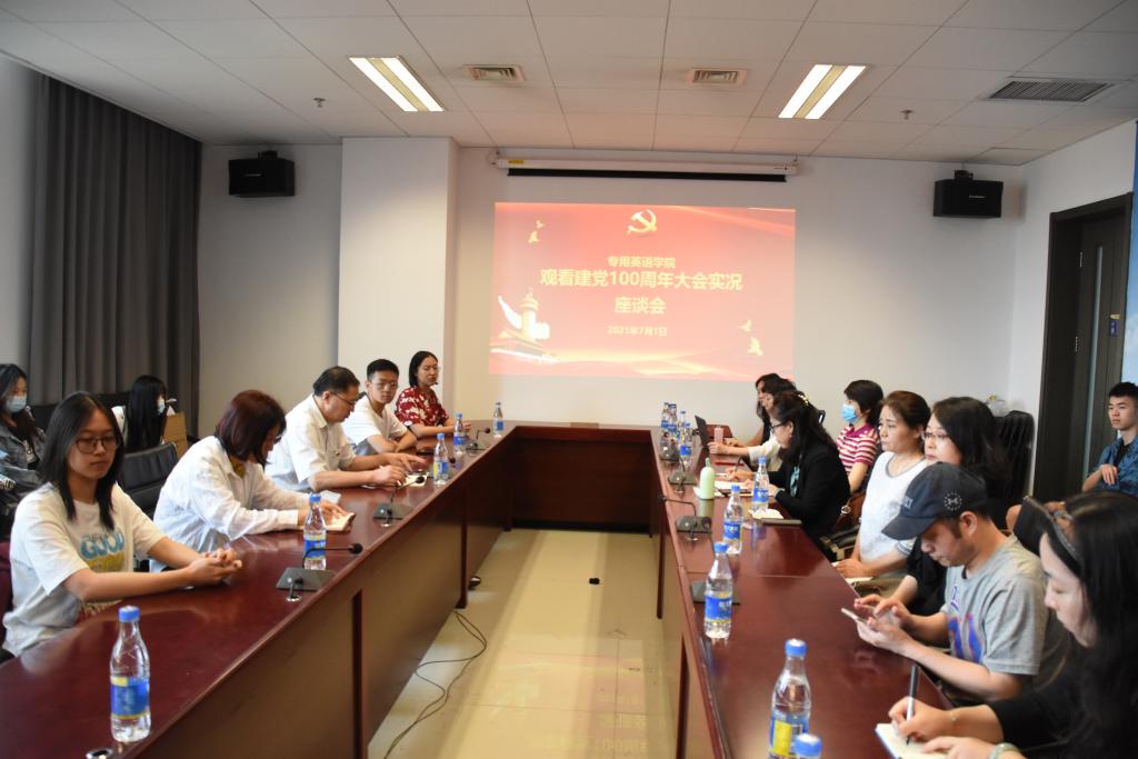 7月1日上午10点,伟德国际victor1946党总支组织全体师生党员、入党积极分子和各班学生在国际大厦礼堂集体观看了庆祝中国共产党成立100周年大会直播,并在直播后召集师生党员和同学代表共计30多人在国际大厦1016召开座谈会。座谈会由党总支书记蔡鸿主持。